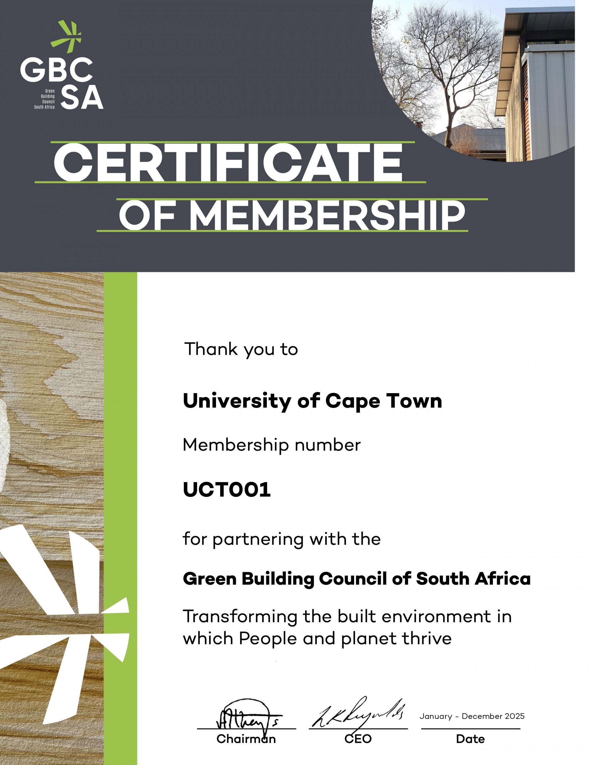 UCT is a member of the Green Building Council South Africa (GBCSA). The GBCSA works in collaboration with its membership community, sponsors and extended network of professionals to inspire a built environment in which people and planet thrive. We advocate solutions and tools that enable the design, construction and operation of all buildings in an environmentally responsible way.